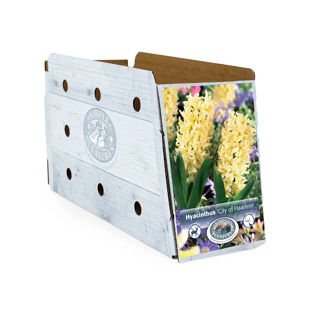 Enhance your inventory with these exceptional 'City of Haarlem' hyacinths, available exclusively to our trade customers. Each capper contains 16 top-size bulbs (15/16) with detailed planting instructions and display options, including peg holes for hanging displays or placement on wooden racks. The eco-friendly packaging is made from 100% renewable, recyclable materials, reflecting DeVroomen's commitment to sustainability while providing your customers with a premium product that delivers reliable results season after season.
