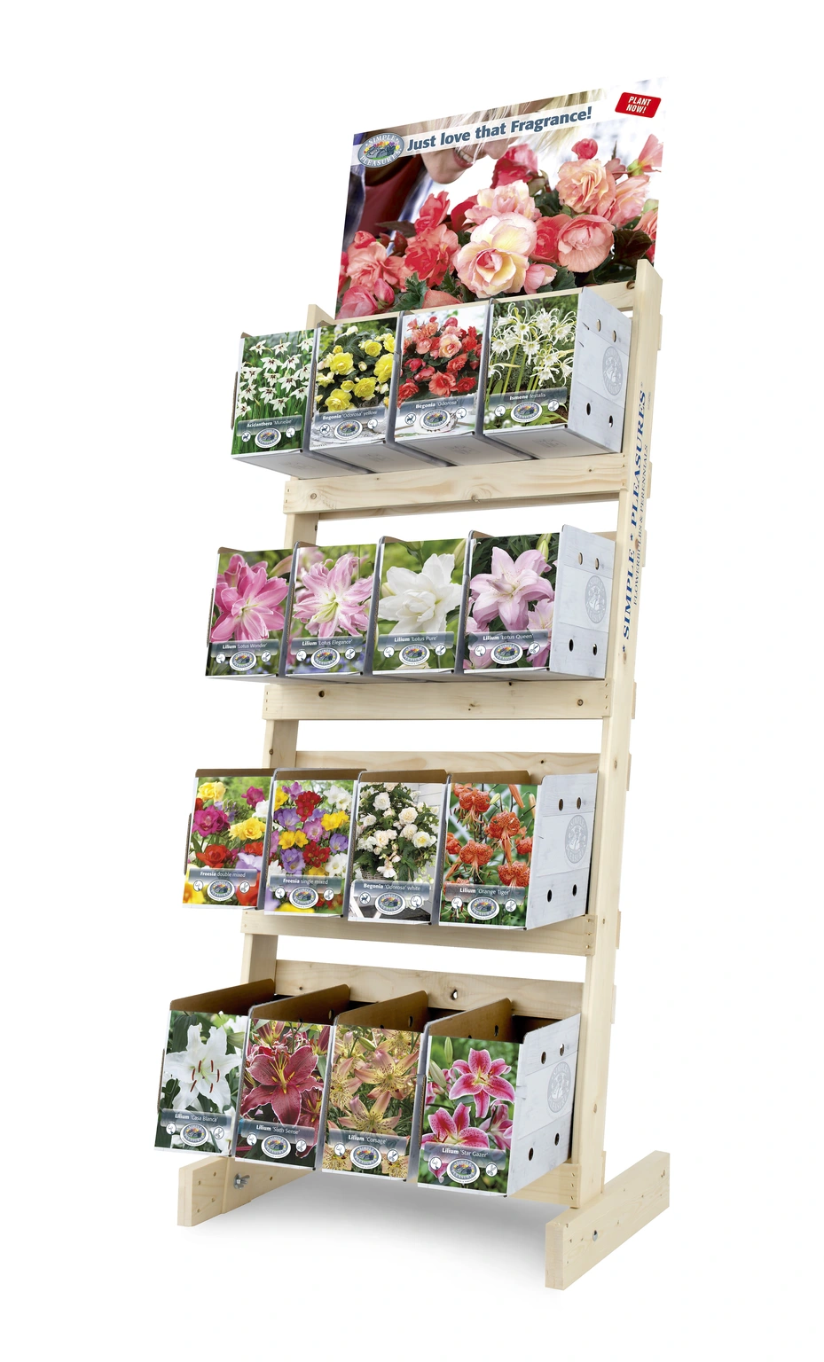 Introducing our Just Love That Fragrance display stand, a carefully curated collection of 240 fragrance-enhancing bulbs designed to boost your retail sales. This complete package includes a wooden display rack and promotional poster, offering your customers an irresistible selection of scented bulbs that transform any indoor space with delightful aromas and ambiance.
